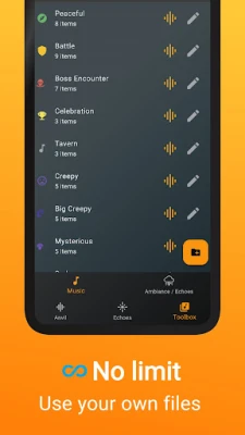 • Use your own files: import MP3, WAV, OGG and organize by campaign, scene, or type