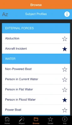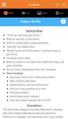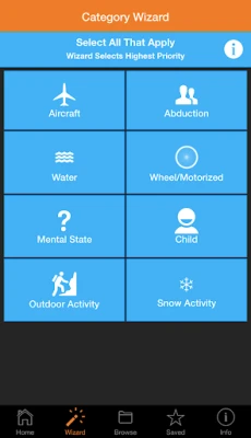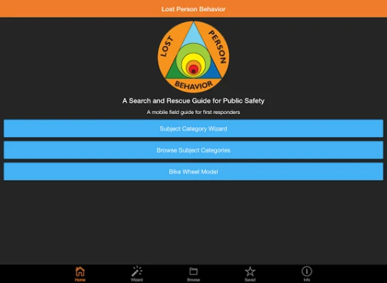 The app guides the user in selecting the correct subject category by several means. The subject category wizard allows the user to select potential scenarios and then will suggest the best match for the subject category. For example, if a child was riding his bicycle and was then known to be abducted, the user could select Child, Wheel/Motorized, and Abduction; the wizard would suggest using the abduction category. Alternately, the user can go straight to a subject category by using favorites, an alphabetical list, or the hierarchy list. Once the subject category is selected, the Lost Person Behavior App provides the user with: