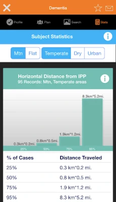 The Lost Person Behavior App can be easily customized to only show the statistical information you actually need. The user can customize for ecoregion, terrain, and urban incidents. The user can view the data in both metric and English units. Several additional helpful tools are built into the app. Contextual help is provided on every page with additional information boxes, which explain every element of the app on the page you need. The information page provides information about the bike wheel model used to describe initial tactical deployment (reflex tasking), a glossary, help, and contact information.
