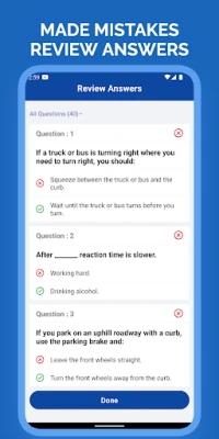 * Extensive Question Bank: The app contains a vast database of practice questions meticulously designed from official driver’s manual to cover all aspects of the test. Our app contains questions on topics such as road signs, traffic laws, safe driving practices, and more.