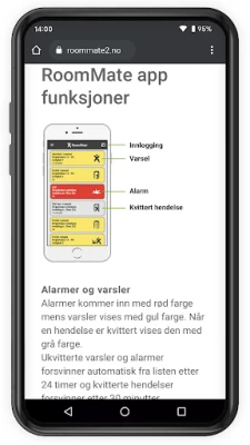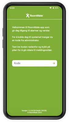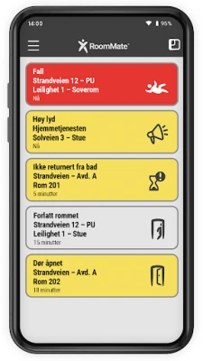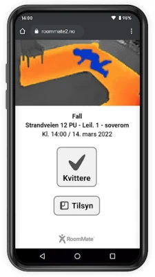 Med RoomMate-appen kan du motta alarmer og varsler fra RoomMate-systemet. Det er også mulig å gjennomføre anonymisert, visuelt tilsyn.