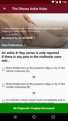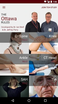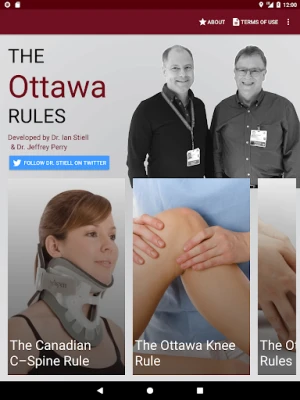 The Ottawa Rules are a set of rapid and interactive decision tools now available on smartphones and mobile devices. Developed through a series of unique studies, Dr. Ian Stiell and his emergency medicine research group developed the Ottawa Knee Rule, the Ottawa Ankle Rule and the Canadian C-spine Rule. The app now offers the Ottawa Rules images with clear guidelines and access to instructional videos, all in the palm of your hand.